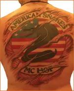 Auf der Suche nach (neuen) Horizonten dominierte uns „Kinder“ von Woodstock, Easy Rider und Co., der American Way of Life (oder was wir dafür hielten). Magisch angezogen vom Mythos und ewigem Vorreiter Amerika, musste das Colour unbedingt einen Bezug herstellen zum „Land of the Free“. Die Schlange ist eher dem damaligen Trend zuzuschreiben. Viel animalisches zierte die Rücken von MCs, Schlangen waren noch nicht vertreten.